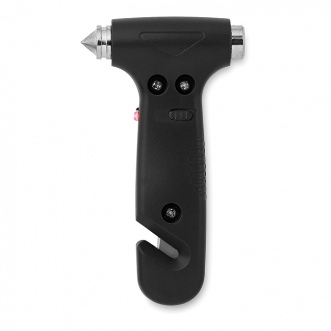 Ciocan de urgenţă 3 în 1 din plastic ABS, cu tăietor pentru centura de siguranţă şi lumină LED. 3 baterii de tip AG3 nu sunt incluse.