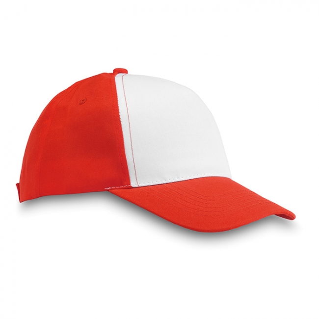 Șapcă cu 5 panele și curelușă reflectorizantă reglabilă. 2 capse cusute în culori asortate. Panel față în culoare albă, rest de paneluri și cozoroc colorat. Mărime 7 1/4.