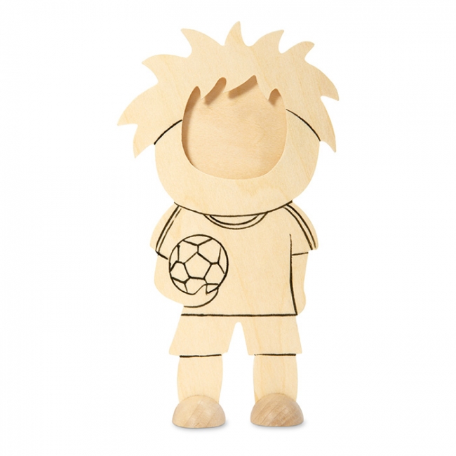 Ramă foto din lemn în formă de jucător de fotbal, cu 6 carioci colorate.
