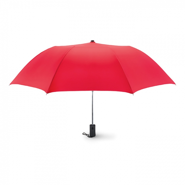 Umbrelă cu deschidere automată de 21 inchi, din poliester satinat 210T, ax, spițe și terminații metalice cu înveliș zincat. Mâner negru din plastic ABS cauciucat. Închidere manuală în 2 secțiuni. Husă asortată.