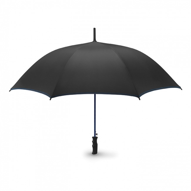 Umbrelă cu deschidere automată, 23 inchi, din poliester satinat 190T, ax cu fibră de sticlă, spițe colorate și terminații negre din plastic. Panele negre cu cusături asortate. Mâner drept negru, din plastic. Închidere manuală.