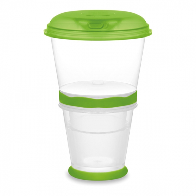 Pahar pentru iaurt, cu 2 compartimente. Include element de răcire și linguriță.