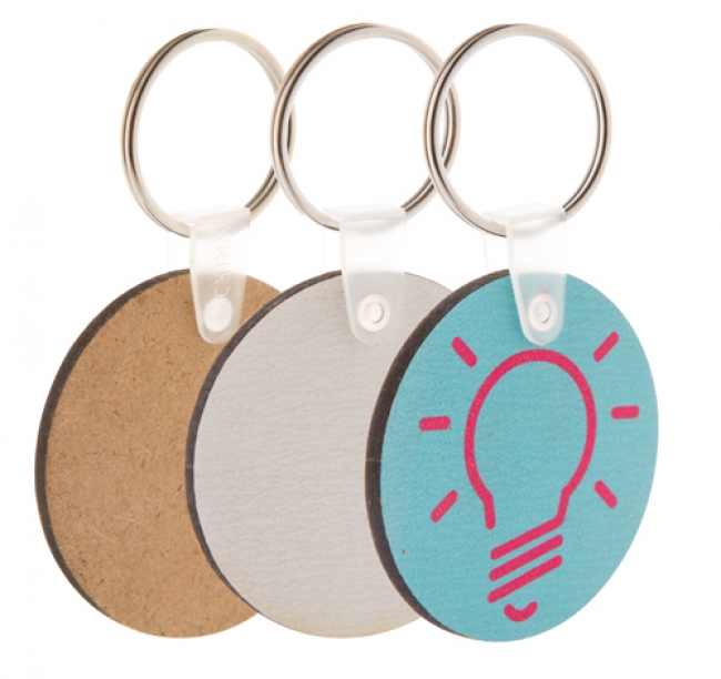 Breloc rotund din HDF, cu imprimare policromie. Prețul include personalizarea cu UV Led. Cantitate minimă de comandă: 200 buc.