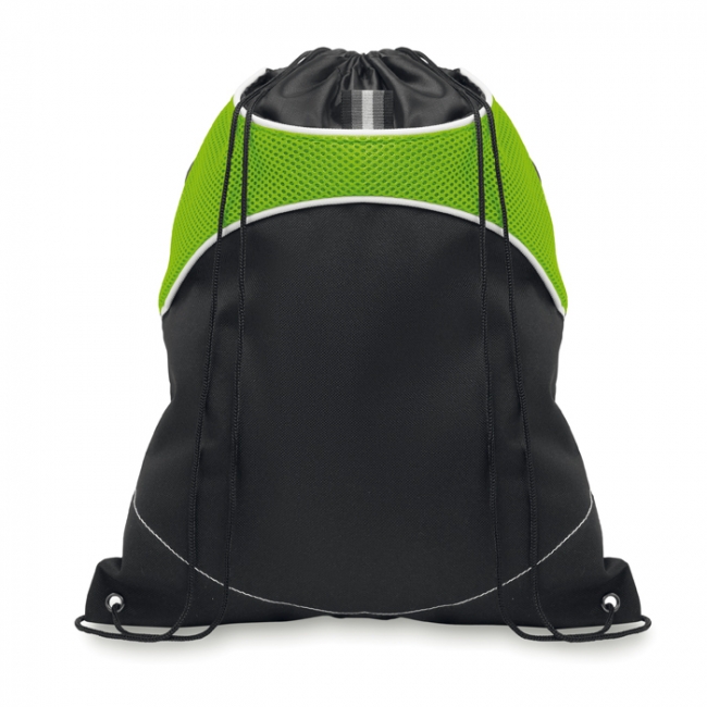 Sac cu cordon din 2 materiale: poliester 600D cu plasa din nylon pe fata si poliester 210D pe spate. Compartiment principal cu buzunar frontal cu inchidere cu nod.