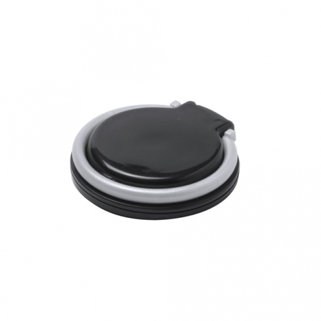 Round shaped, plastic mobile holder with self-adhesive base.