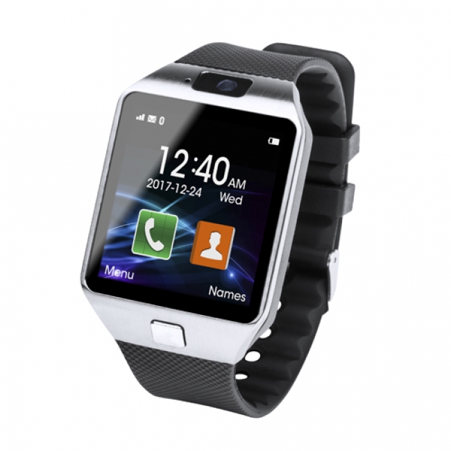 Multilingual, bluetooth smart watch with 1,54" LCD screen, stainless steel housing and silicon strap. Including USB charger cable.