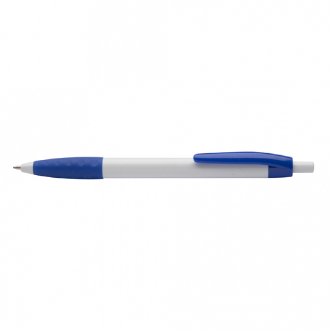 Plastic ballpoint pen with coloured rubber grip. With blue refill.