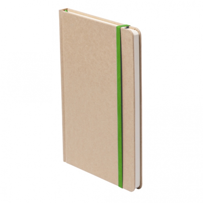Cardboard covered notebook with 100 sheets, coloured bookmark and rubber strap. Design Raimok