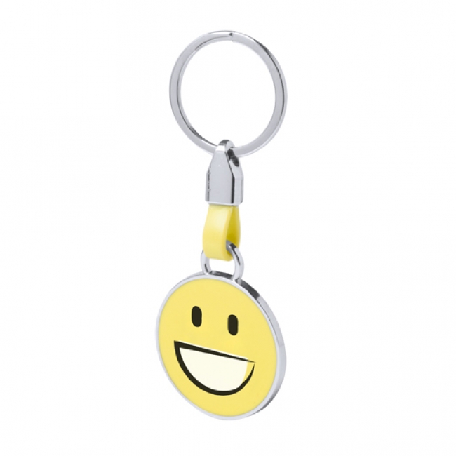 Metal keyring with emoticon decoration.