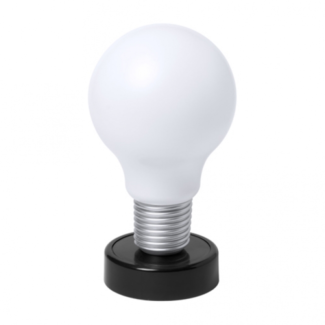 Light bulb shaped, plastic desk lamp with 1 LED. Operates with 4 AA batteries, without battery. Design Slanky