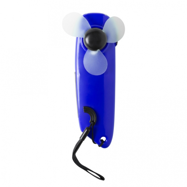 Plastic manual fan with 2 LED flashlight. With button cell battery.