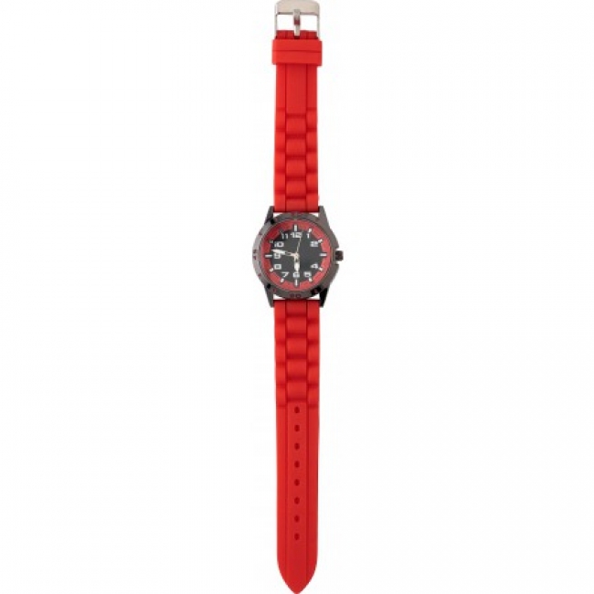 Small, alloy and mineral glass watch for women, with silicon strap. Includes a coloured ring on the dial, matching the strap. Presented in a clear plastic box. Batteries included.