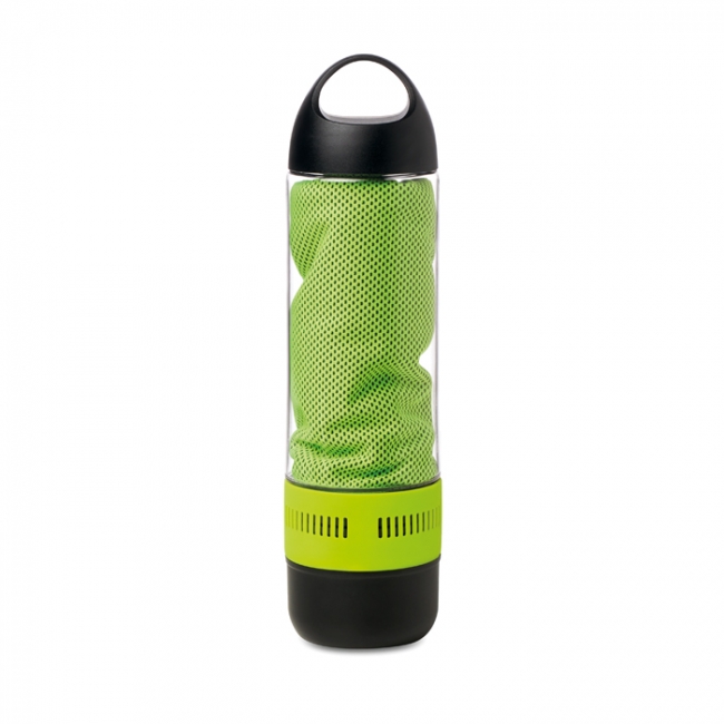 Sticlă de băut cu capcitate de 500 ml și boxă fără fir. Include prosop realizat din  55% fibre de poliester (30x80cm) și baterie reîncărcabilă Li-on de 300mAh. Cablu USB Mirco inclus. Date de ieșire: 3W.