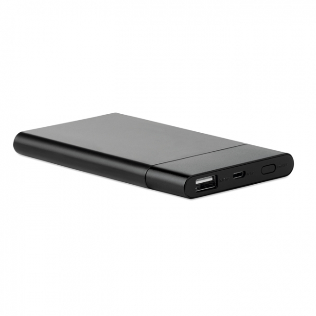 Baterie externă de 4000 mAh cu cablu integrat. Compatibilă cu smartphone, date de ieșire DC5V/1A. Include conector Tip C și led de lumină care evidențiază logoul în timpul încărcării.