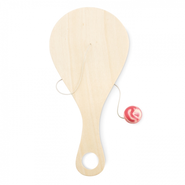 Paletă mică din lemn cu minge atașată.