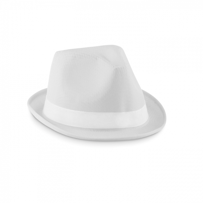 Pălărie colorată din paie, cu bandă albă din poliester.