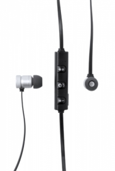Aluminium, bluetooth in-ear earphones with hands-free call function and built-in rechargeable battery. With USB charger cable.