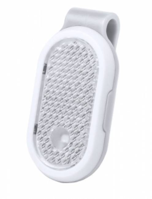 Plastic flashlight with 2 LED (red and white) and reflective inlay, clip for attaching to a backpack, waistbag or jacket.