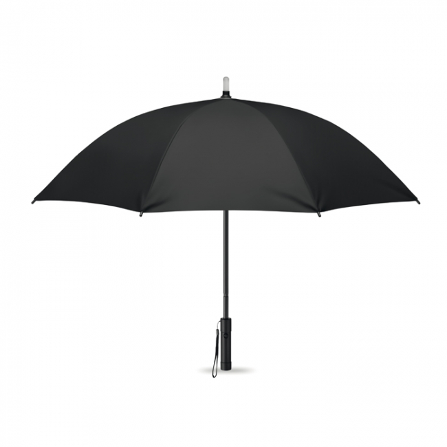 Umbrelă de 23 inchi, cu deschidere manuală, din poliester fin 190T, cu ax din aluminiu, spițe din fibră de sticlă și terminații negre. Închidere manuală. Prevăzută cu un LED de lumină în vârf cu 2 moduri de iluminare și lanternă în capatul mânerului. Funcționează cu 3 baterii tip AAA, neincluse.