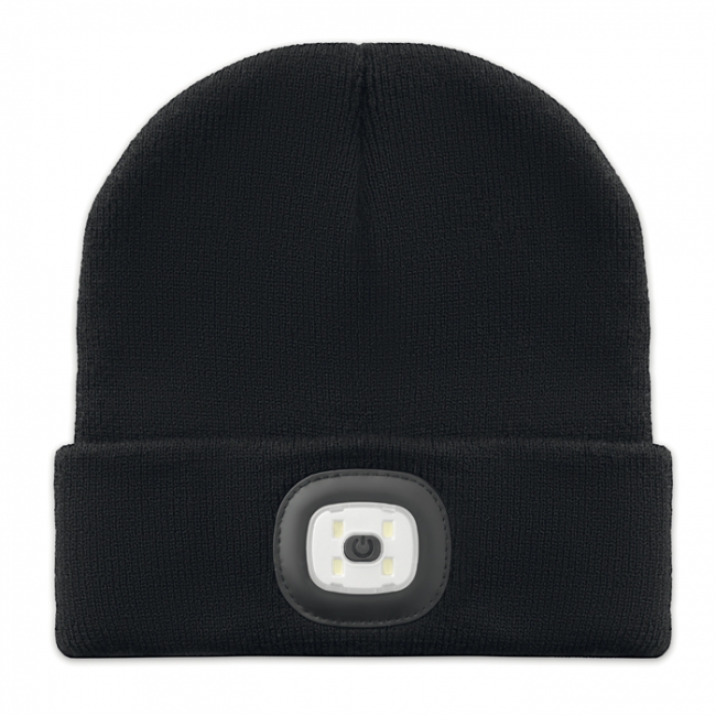 Căciulă din acril cu lumină frontală tip COB, detașabil. 3 niveluri de luminozitate. Include baterie reîncărcabilă de 150 mAh și cablu de încărcare USB.