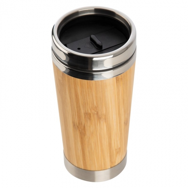 Stainless steel drinking mug with bamboo sheathing, drinking sliding bar, and 400ml capacity. Your logo will be engraved on the sheath.Brand :