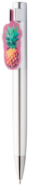 Plastic ballpoint pen with custom made clip and blue refill. The clip is made in custom shape - maximum size: 25×35 mm. Price includes UV LED printing on clip. MOQ: 100 pcs.
