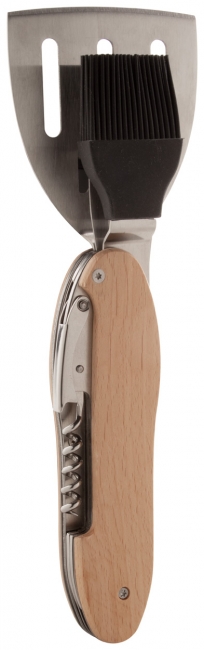 5 in 1 folding BBQ multi tool in stainless steel with wooden handle. With spatula, fork, brush, bottle opener and corkscrew. Separates into 2 separate tools through a sliding system.Design : Alabama