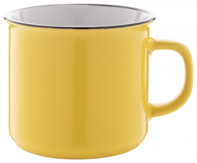 Vintage ceramic mug with black rim, white inside and coloured outside, 320 ml. Delivered in gift box.