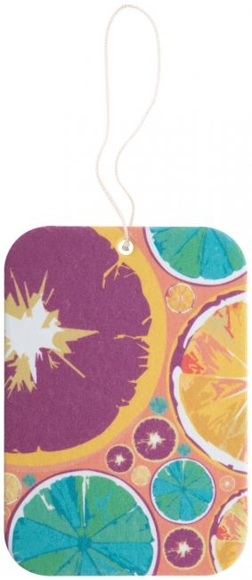 Car air freshener with custom fragrance (vanilla, exotic, ocean, menthol, coconut, lemon, melone, peach, strawberry, fresh). With full colour printing on both sides. MOQ: 250 pcs.