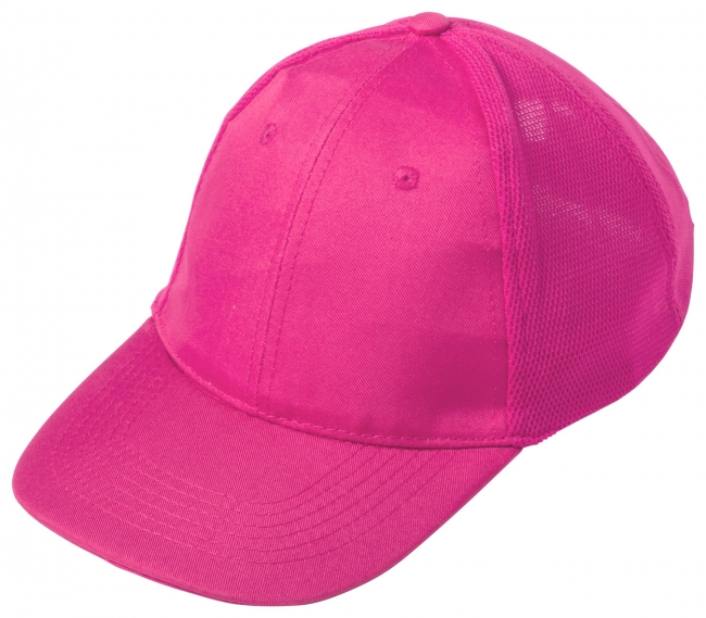 6 panel baseball cap with mesh back and plastic size adjustment strap. Polyester and microfiber.